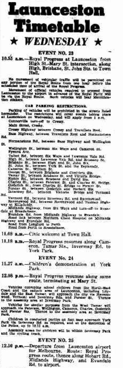| 1954 | Queen and Duke of Edinburgh visit Hobart, North-West and Launceston |