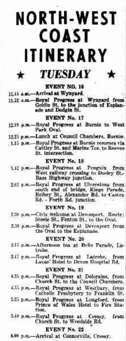 | Tuesday 23 February 1954 | Fly from Hobart to Wynyard Visit Burnie, Penguin, Ulverstone, Latrobe, Deloraine, Westbury, Longford Overnight in Cressy at the historic Connorvale |