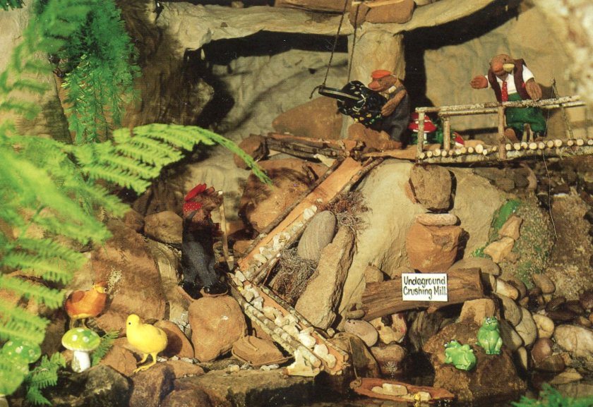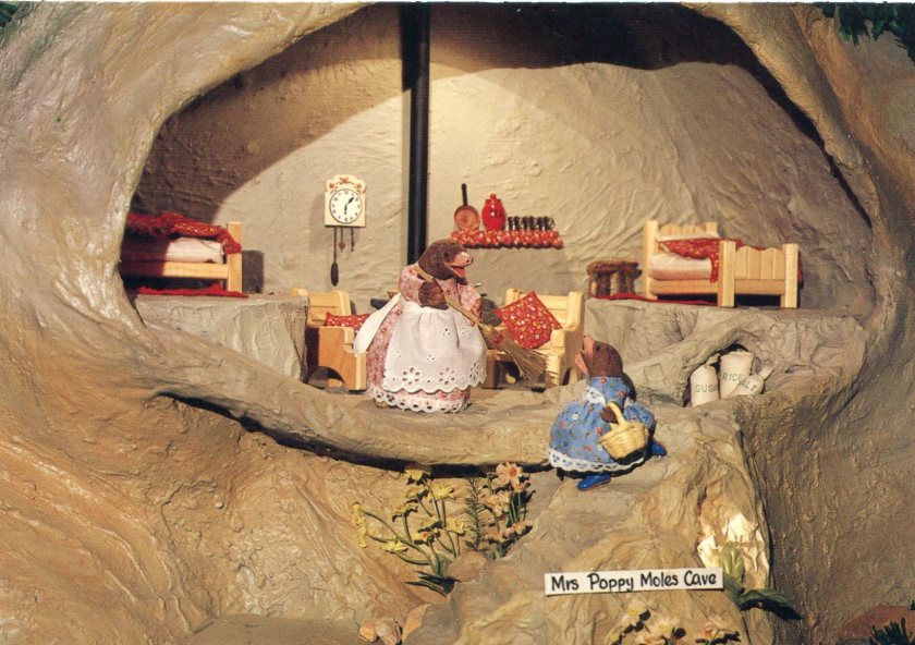 The moles were around 15 cm (6 inches high), dressed as humans and going about their every day business of pre-industrial life. This included mining, grinding acorn flour, baking and so on, and then moved to the more domestic scene. Nearly all furniture and machinery were hand-crafted miniatures