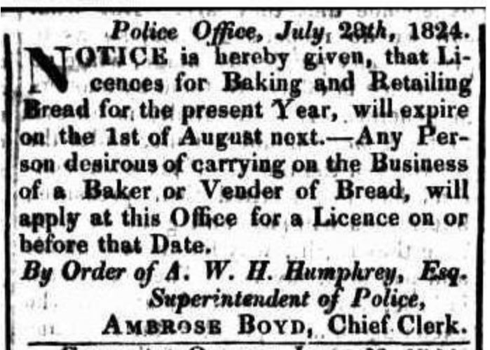 Information about Humphrey’s life can be further gleaned from the newspapers of the time. This includes a period where he was Superintendent of Police, and followed up such matters such as issuing licences for the baking and retailing of bread. In 1822, Humphrey was a founding member of an Agricultural Society for which he was Vice-President.