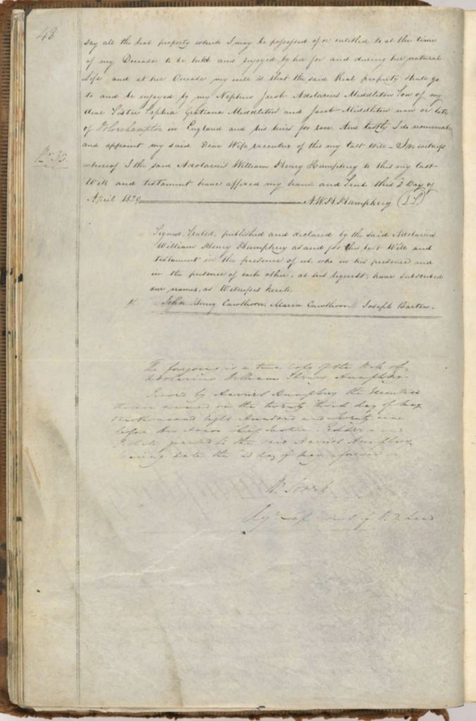 Humphrey retired in 1828, at a young age, due to ill health. By this time, he was living on his estate, which he modestly named ‘Humphreyville’, which is the area we now know as Bushy Park. He died a year later in 1829 at the age of 47 years, survived by Harriet. They had no children. Humphrey’s Will named Harriet as his beneficiary for the term of her life. Upon her death, Humphrey’s estate was to be transferred to his sister Sophie’s son, Jacob Adolarius Middleton.